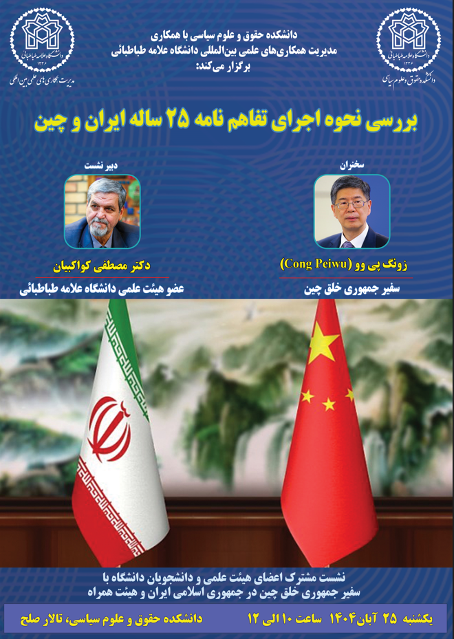 نشست مشترک اعضای هیئت علمی و دانشجویان دانشگاه علامه طباطبائی با سفیر جمهوری خلق چین در جمهوری اسلامی ایران و هیئت همراه، با موضوع «بررسی نحوه اجرای تفاهمنامه 25 ساله ایران و چین»، به همت دانشکده حقوق و علوم سیاسی با همکاری دفتر همکاریهای بینالمللی دانشگاه علامه طباطبائی برگزار میشود.